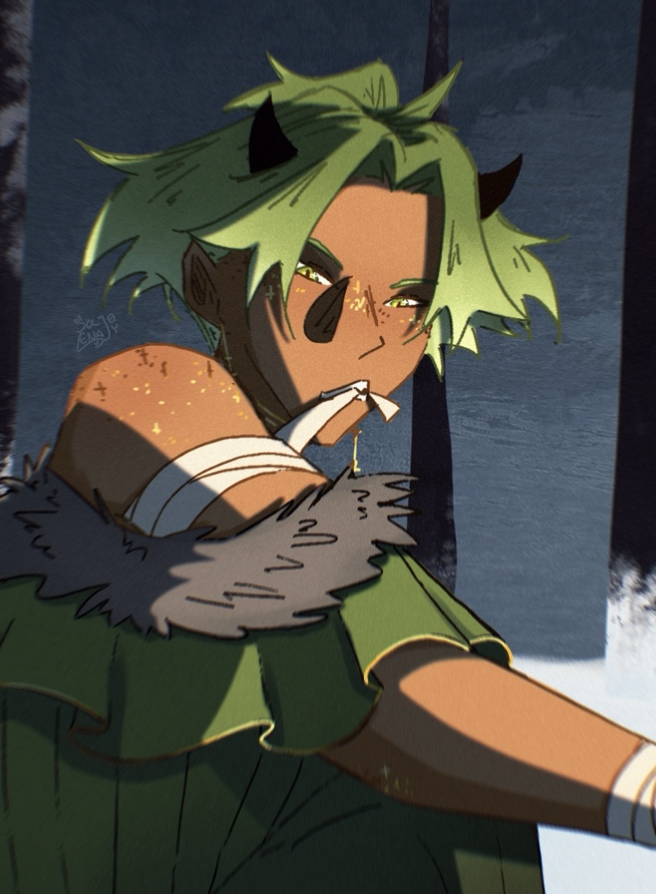 Tealeaf lives in quiet defiance of her own power, refusing to let it be the dark thing it once was. Every act of healing leaves her wrapped in fresh scars and bandages, yet she offers it freely, stubbornly, even when it costs her more than most would ever give. She’s book-smart and sharp-tongued, known to throw things when her patience runs thin, but her heart is steady, plants, animals, and people alike flourish under her care, and no one will ever take that from her.