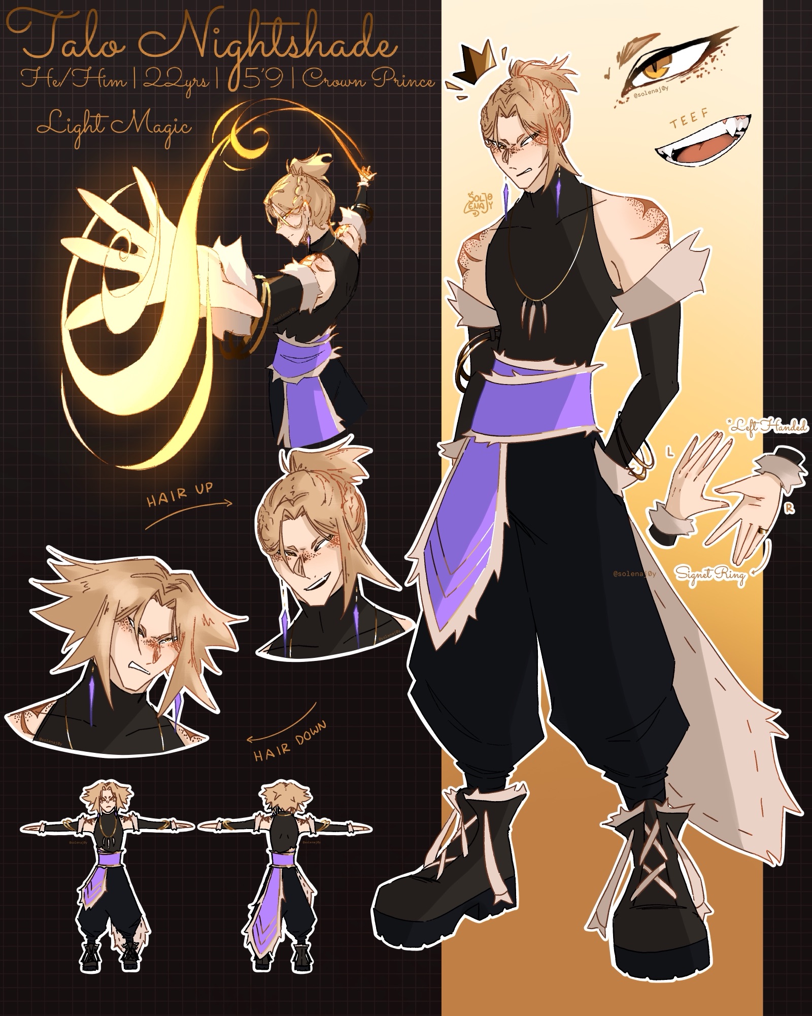 Lost his parents(the king and queen) in a fire when he was young, he would have perished as well if not for receiving his light magic just as he was about to run into the burning building to try and save his parents.